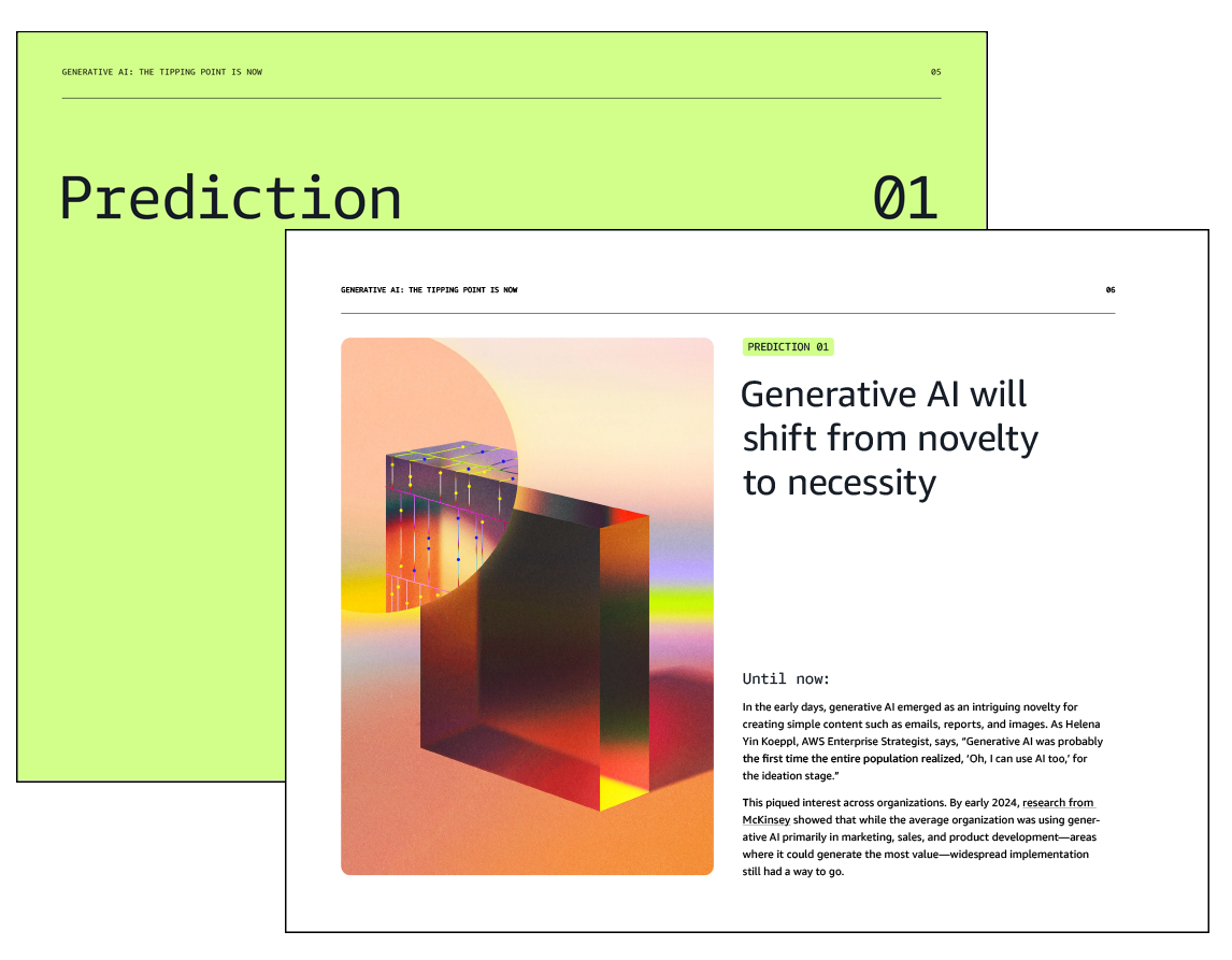 Generative AI is no longer a novelty – it’s a necessity. And this necessity is accelerating faster than you might think. In this new report, AWS experts — with a combined 50 years of experience in digital transformation — share their predictions on how generative AI will reshape industries, reinvent workforces, and ignite innovation in 2025 and beyond.